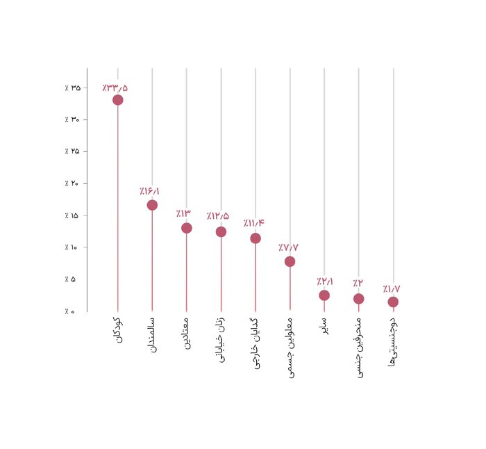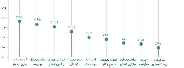 فقدان نهادهای حامی از افراد نیازمند با ۹.۲ درصد، نداشتن مهارت و فنون شغلی با ۷ درصد، پیری و معلولیت با ۶.۵ درصد و مهاجرت از روستا به شهرها با ۴.۷ درصد از دیگر موارد اشاره شده است.