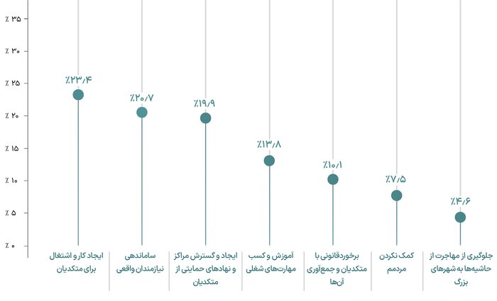 ۲۲.۲ درصد باقی مانده نیز راهحلهای برخورد قانونی با متکدیان و جمعآوری آنان (۱۰.۱ درصد)، کمک نکردن مردم (۷.۵ درصد)، جلوگیری از مهاجرت از حاشیهها به شهرهای بزرگ (۴.۶ درصد) را پیشنهاد دادهاند.